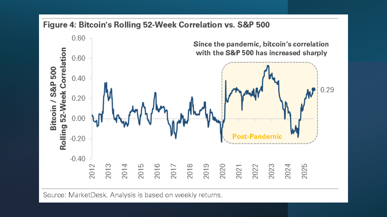 In its early years, Bitcoin largely moved independently from the stock market. This made it appealing to investors looking for assets that behaved differently from traditional investments. However, since the pandemic, its price has become more closely linked to the stock market. Since 2020, Bitcoin’s correlation to the S&P 500 has shifted higher, indicating it’s more impacted by factors like interest rates and investor sentiment. This shift reflects Bitcoin’s integration with the traditional financial system via ETFs, futures, and institutional trading. As a result, Bitcoin may no longer provide the diversification it once did, particularly in periods of market stress.